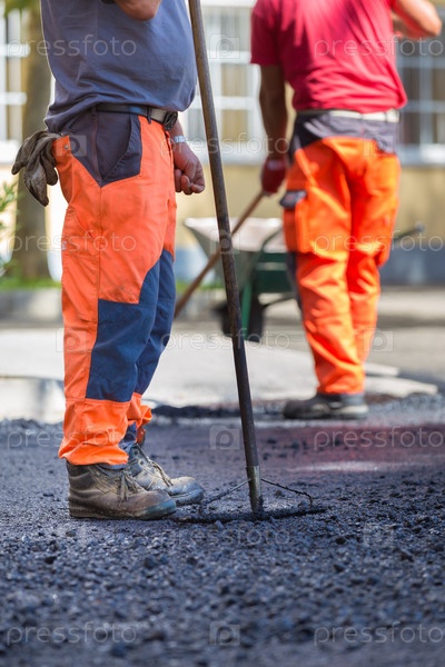Рабочие ровняют асфальт