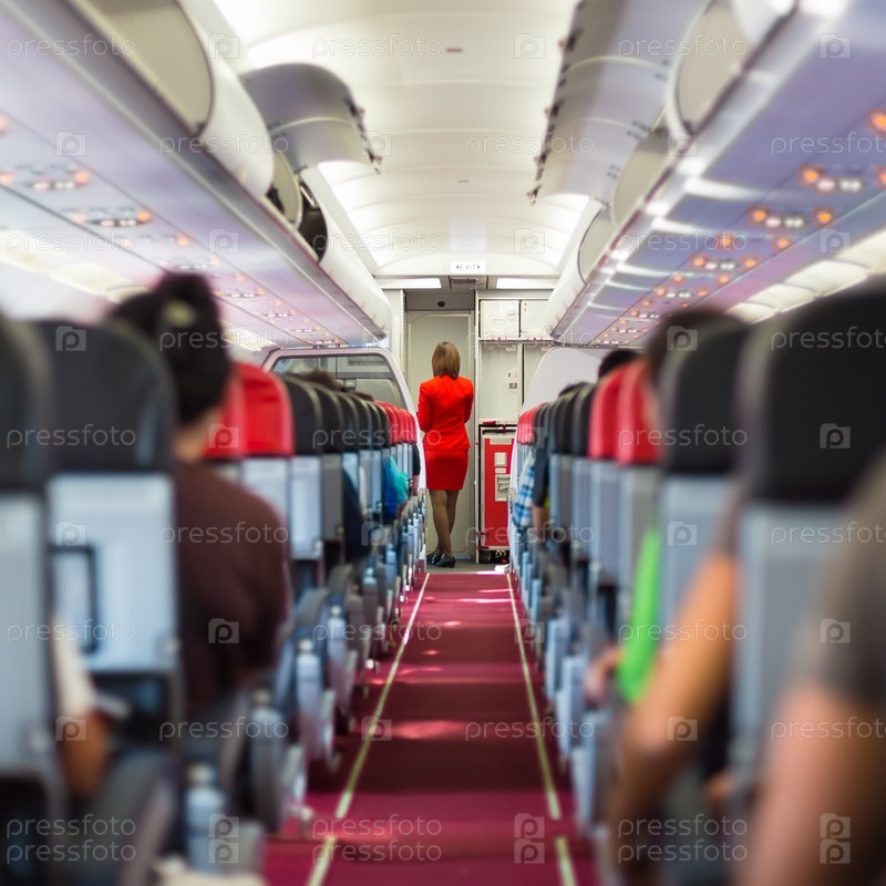 Стюардесса и пассажиры в салоне самолета