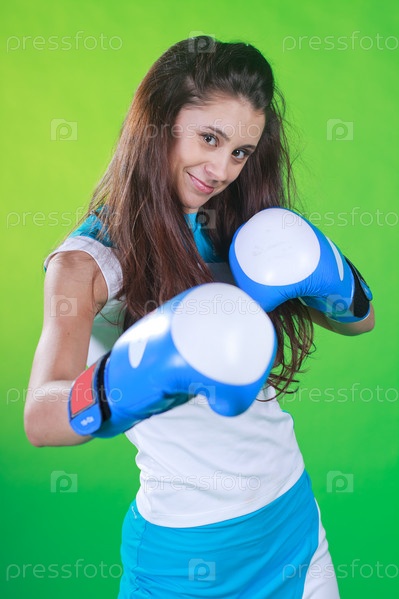 Девушка в боксерских перчатках с длинными волосами на зеленом фоне