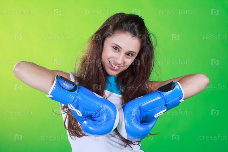 Девушка в боксерских перчатках с длинными волосами на зеленом фоне