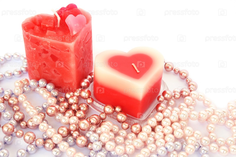 Красные свечи в форме сердца и ожерелье на белом фоне