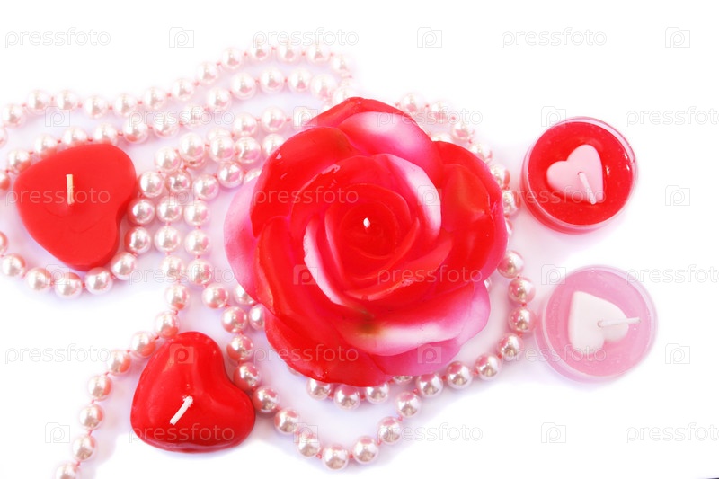 Сердце, красные свечи и ожерелье на белом фоне