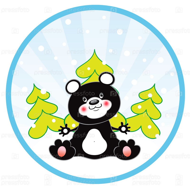 Черный медвежонок на круглом фоне с елками