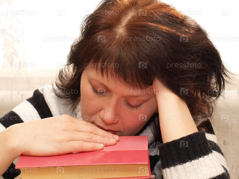 Усталая женщина задремала на книге