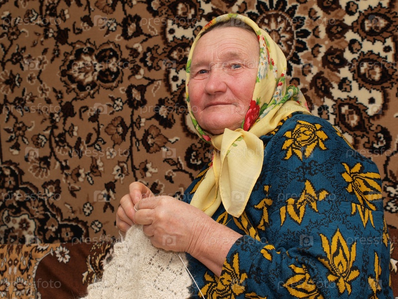 Пожилая женщина вяжет белую шаль