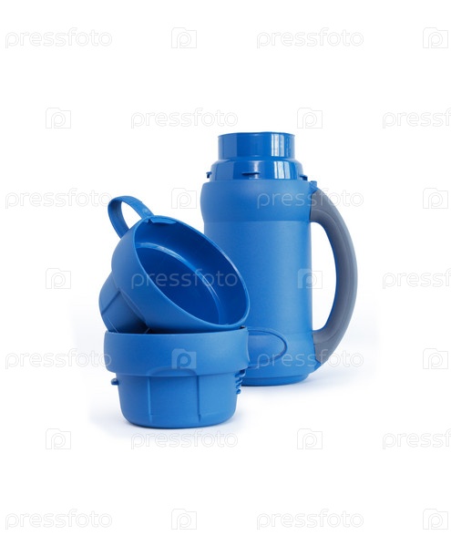 Современный синий термос и две пустые чашки на белом фоне. изолировано на белом фоне