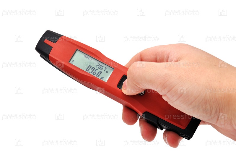 Лазерный прибор для измерения расстояния в руке на белом фоне