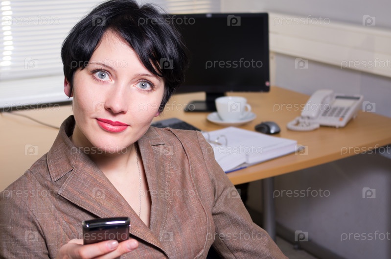 Деловая леди с мобильным телефоном на рабочем месте