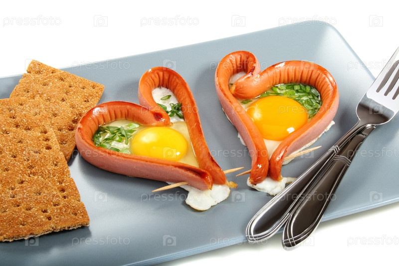 Две сосиски в форме сердца и яичница с зеленым луком