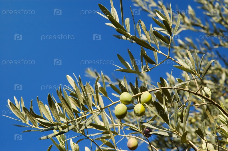 Зеленые оливки на ветвях дерева