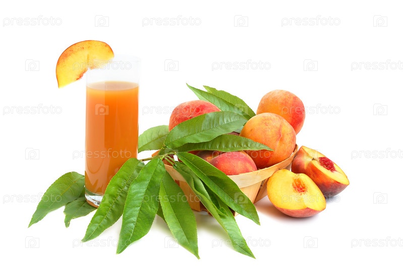 Свежие персики с листьями и свежевыжатый сок на белом фоне