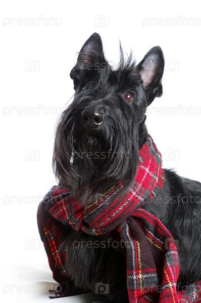 Шотландский терьер в красном шарфе на белом фоне