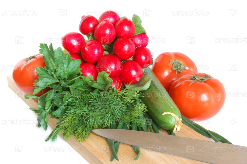 Огурцы, помидоры, редис и зелень на белом фоне