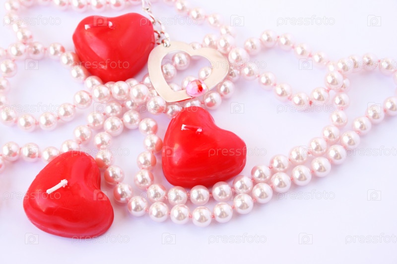 Красные свечи и ожерелье на сером фоне
