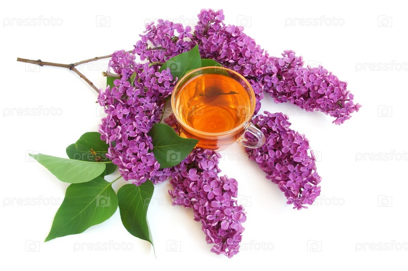 Стеклянная чашка с зеленым чаем и ветка сирени на белом фоне