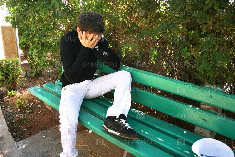 Плачущий человек на скамейке в парке