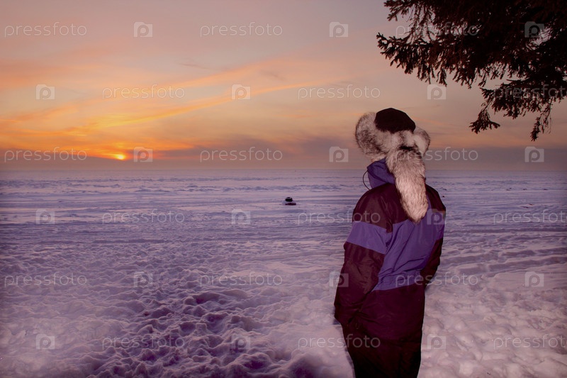 Мужчина в меховой шапке, смотрящий на закат