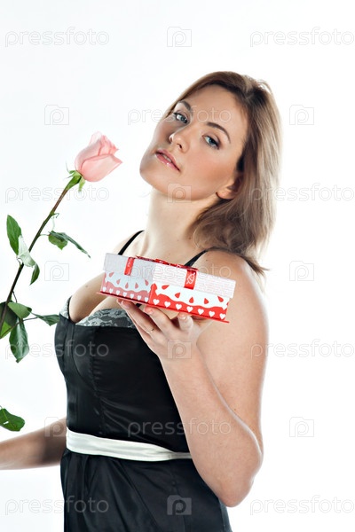 Девушка с подарком и розой на белом фоне