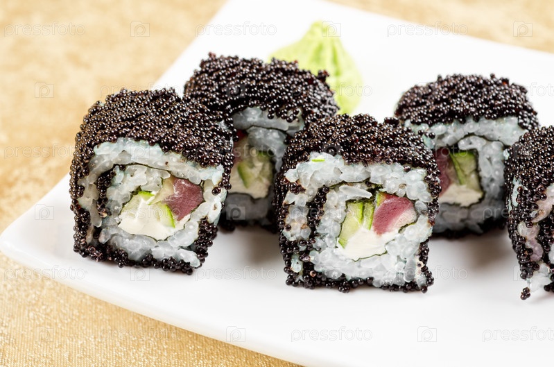 Суши с тунцом, авокадо, соусом и икрой летучей рыбы, крупный план