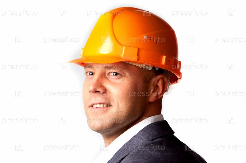 Строитель в оранжевой каске и деловом костюме