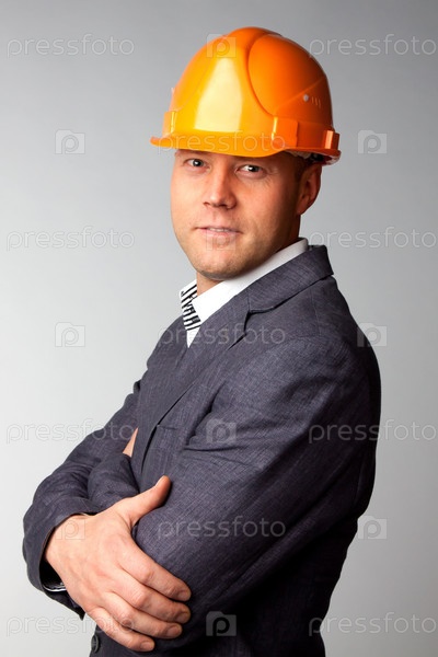 Строитель в оранжевой каске и деловом костюме