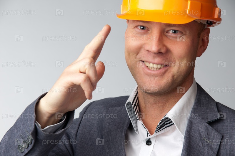 Строитель в оранжевой каске и деловом костюме