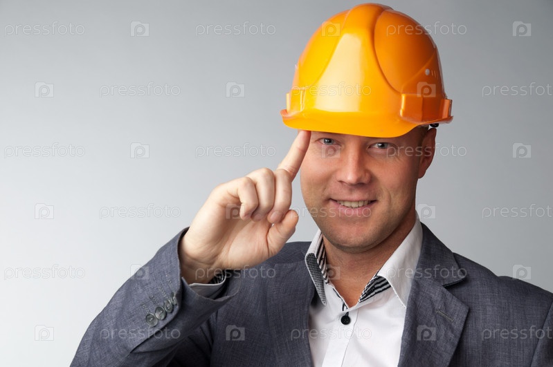 Строитель в оранжевой каске и деловом костюме