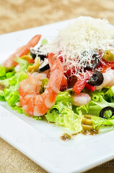 Салат с креветками, икрой, кальмарами, оливками, помидорами и сыром моцарелла