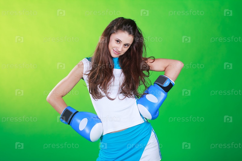Девушка в боксерских перчатках с длинными волосами на зеленом фоне