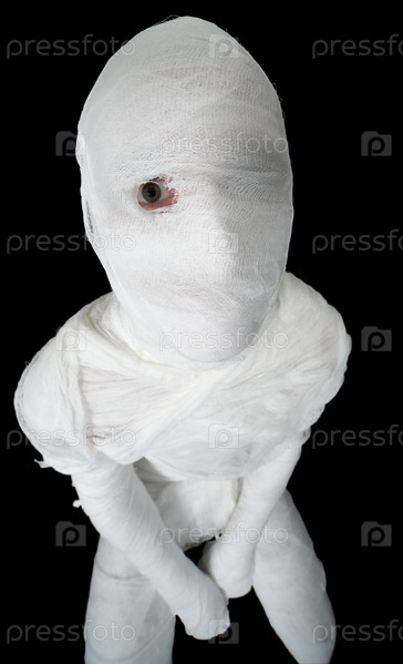Мумия с открытым одним глазом на черном фоне