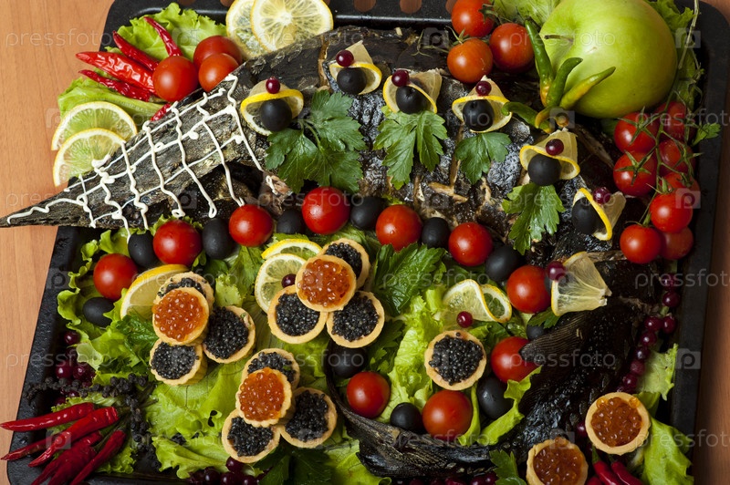 Русская кухня: запеченная осетрина с черной и красной икрой