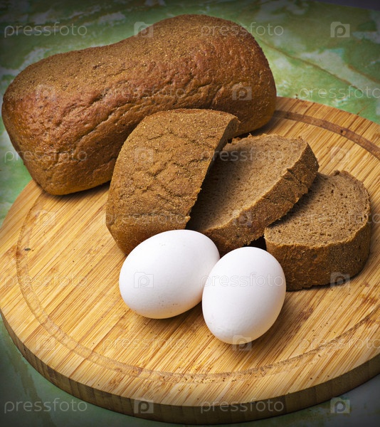 Свежий хлеб и яйца на деревянной доске