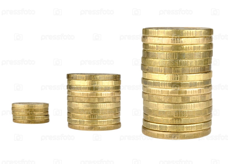 Три стопки денежных монет на белом фоне