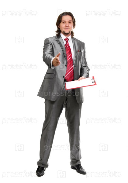 Бизнесмен с документами на белом фоне