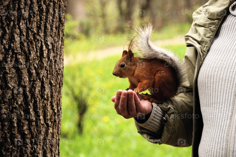Белочка сидит на руке человека в парке