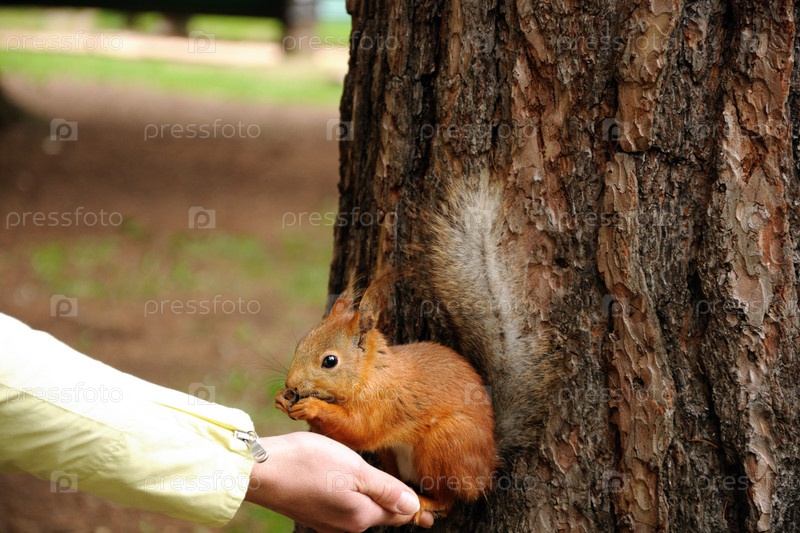 Белка ест из руки человека в парке
