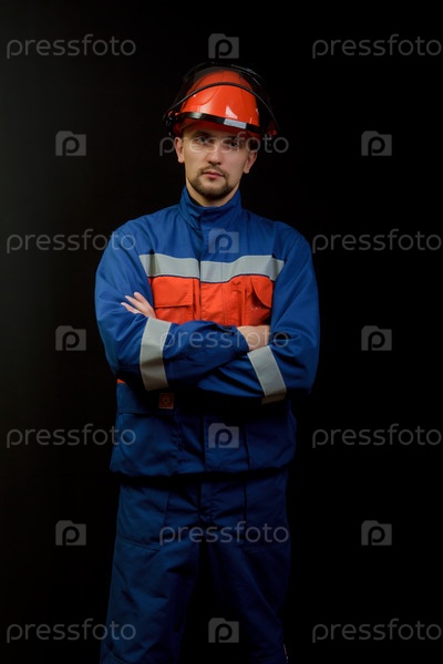Мужчина в рабочем комбинезоне и каске на черном фоне