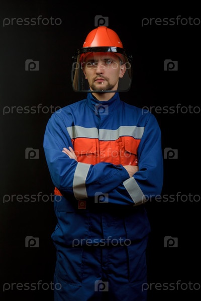 Мужчина в рабочем комбинезоне и каске на черном фоне
