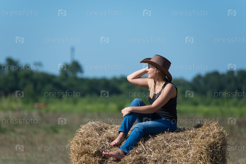 Хорошенькая молодая девушка на стоге сена