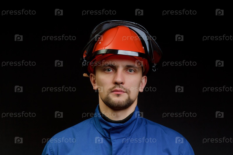 Рабочий в форме и защитной каске на черном фоне