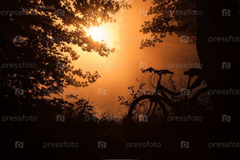 Велосипед на берегу озера на закате