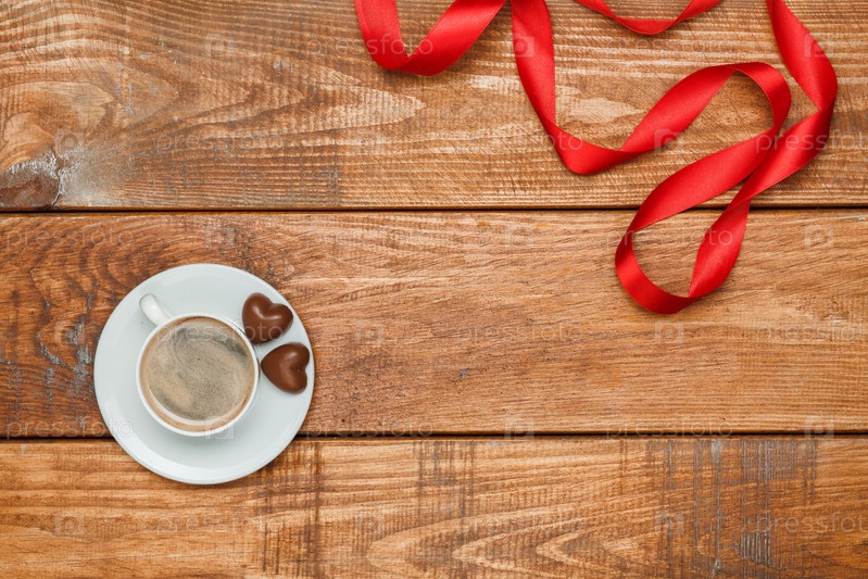 Красная лента на деревянных фоне с чашкой кофе