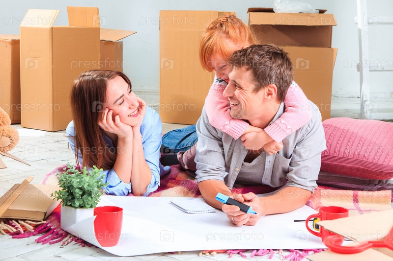 Счастливая семья во время ремонта и переезда