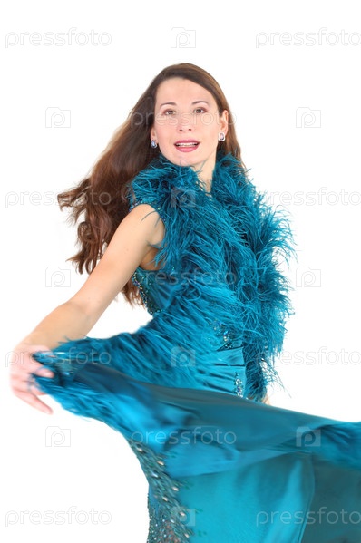 Танцующая женщина с длинными волосами на белом фоне