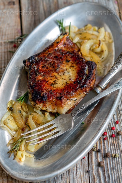 Отбивная из свинины с жареным луком и розмарином