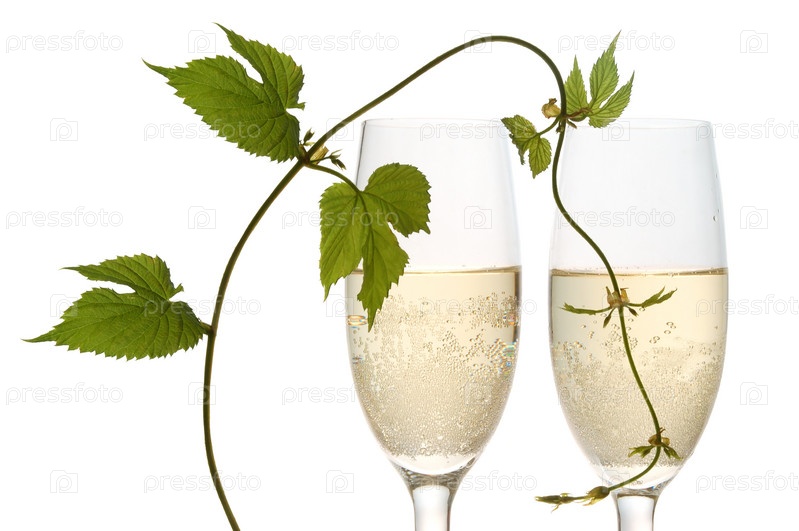 Бокалы шампанского и виноградная лоза на белом фоне