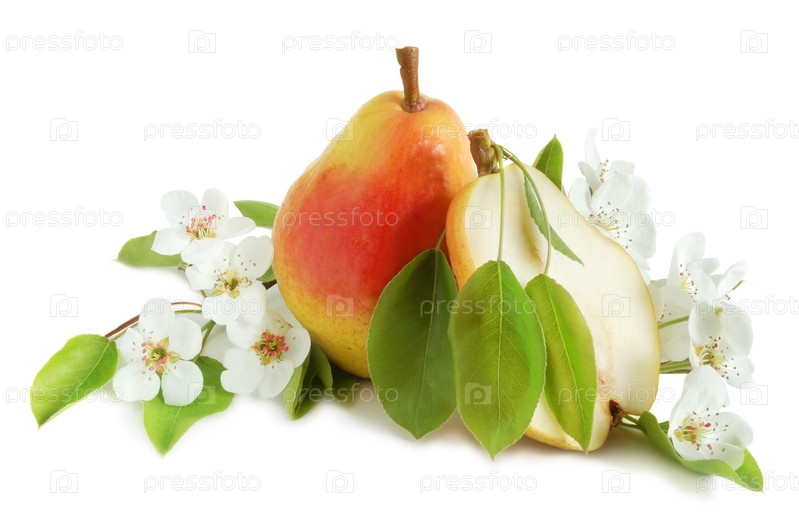 Желтые груши с зелеными листьями и цветами на белом фоне
