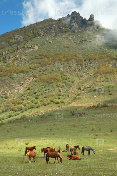 Лошади на лугу в горах