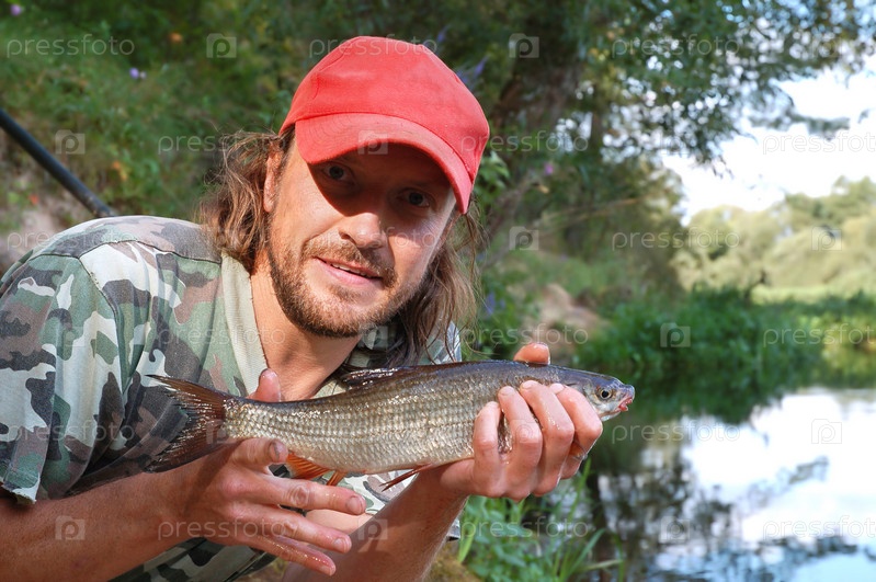 Рыбак с уловом на берегу реки