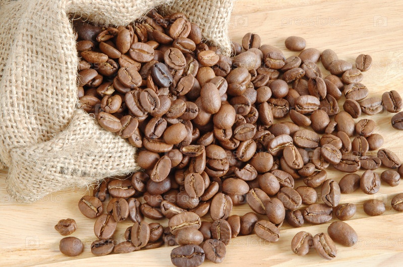 Кофейные зерна в мешке на деревянной доске